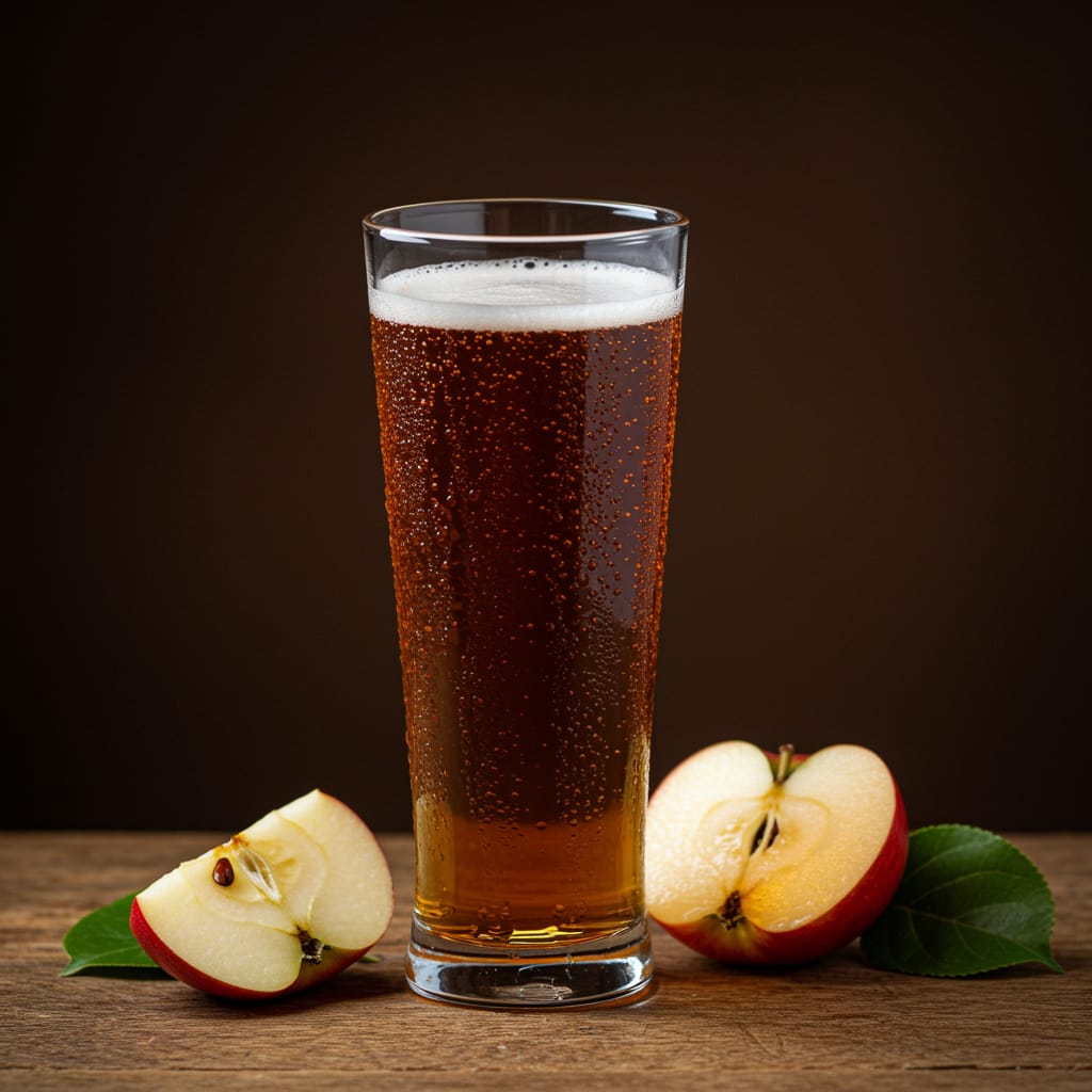 Traditional English cider, either alcoholic or non-alcoholic, representing the rural orchards and countryside pubs central to village social life.