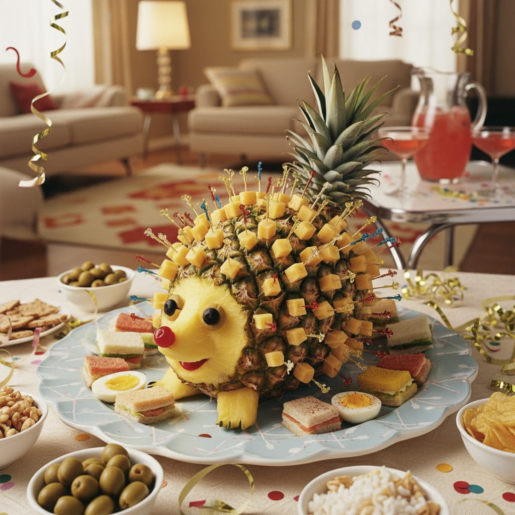 A whimsical 1950s-1960s party centerpiece: a pineapple studded with cheese cubes on cocktail sticks—playful, retro, and period-perfect for the era.