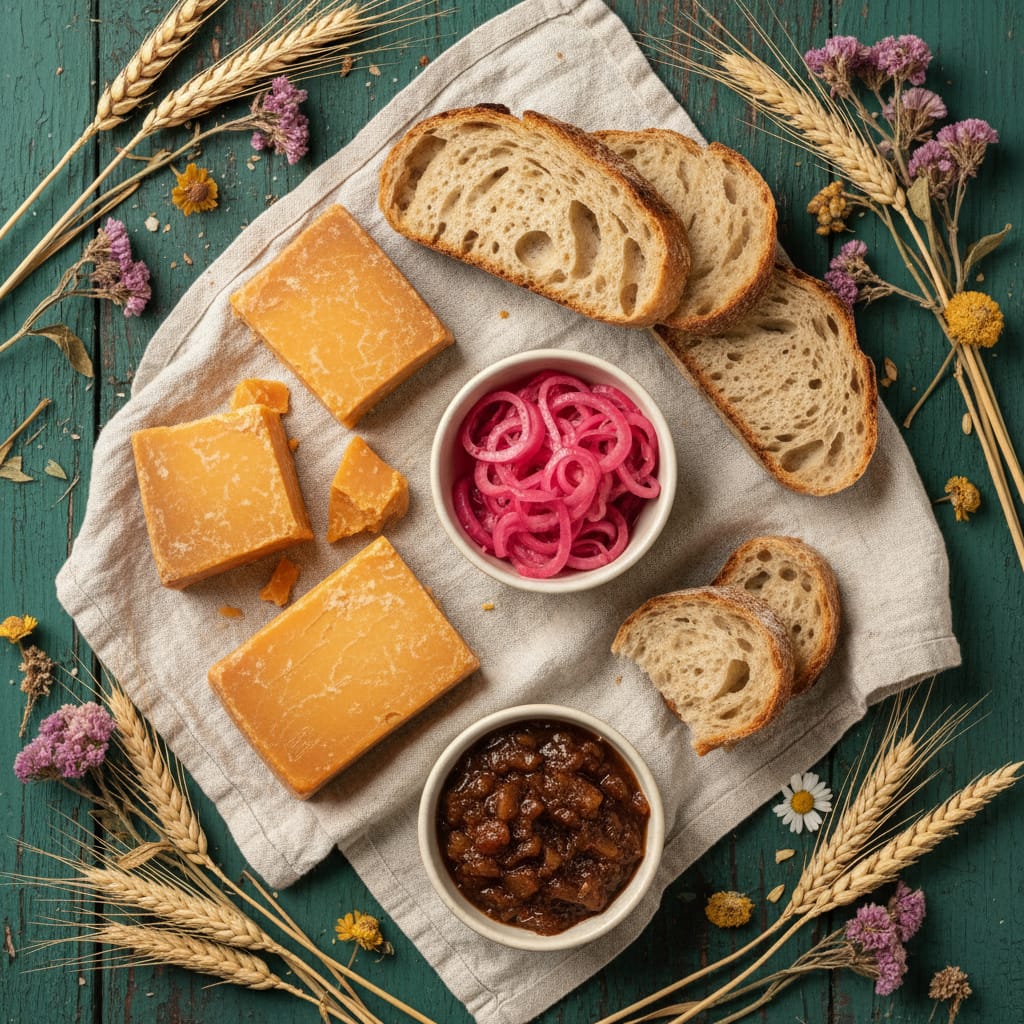Aged farmhouse cheddar, crusty bread, pickled onions, and chutney—a classic British ploughman's lunch that honors the farming life central to the story.