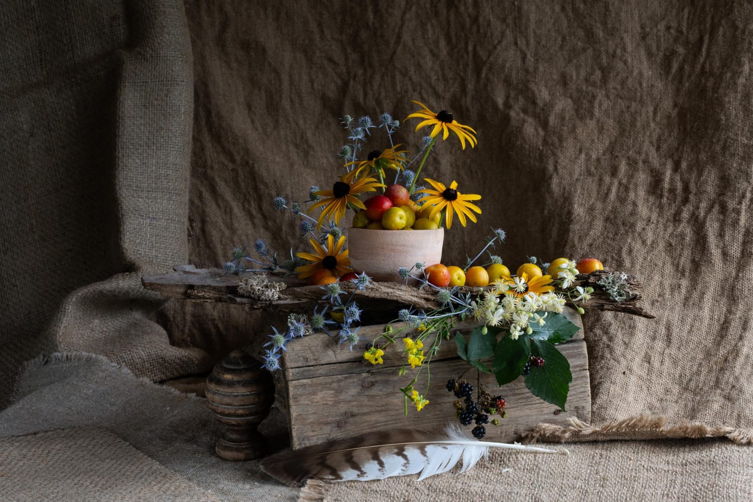 Arrange a small chalkboard or printed calendar showing lambing season, harvest time, and market days—the agricultural rhythms that structure farm life—alongside pressed flowers and wheat stalks to show how the natural world's cycles contrast with the emotional upheaval of the characters. This display grounds the drama in the steady, demanding work of the land that continues regardless of human heartbreak.