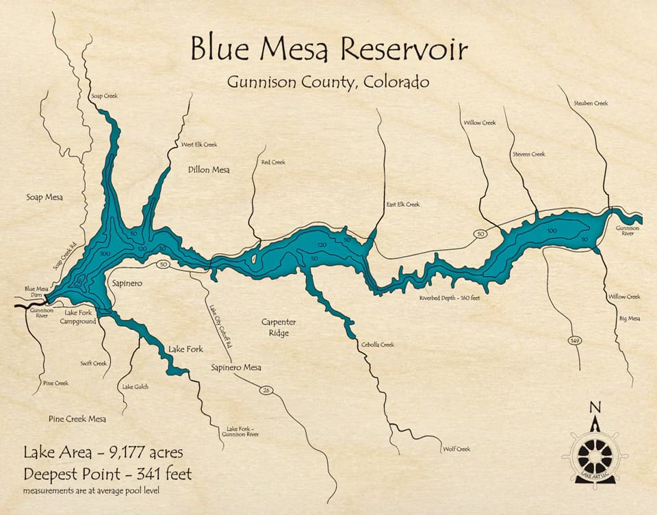 Pin up a reproduction 1940s–50s map of western Colorado, highlighting the Gunnison River and the area around Iola and Blue Mesa Reservoir. Add a small placard about the real history of the dam and the drowned town.