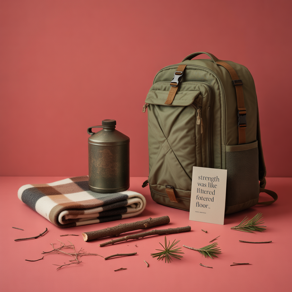 On a side table, display a small backpack, a vintage canteen, a wool blanket, and a few foraged‑looking items (twigs, pine needles) to evoke Victoria’s time alone in the mountains. A tiny card with “Strength was like this littered forest floor” adds depth.