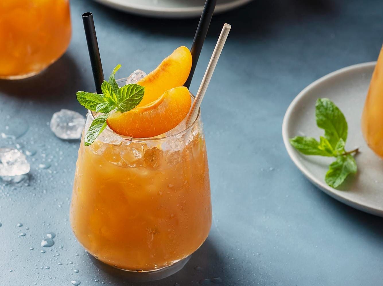 Brew a strong black tea, add a splash of peach nectar, lemon, and mint, and serve over ice as a long, “river-colored” drink that hints at both water and peaches. Offer a version spiked with bourbon for those who want something stronger and one without alcohol for a more reflective tone.
