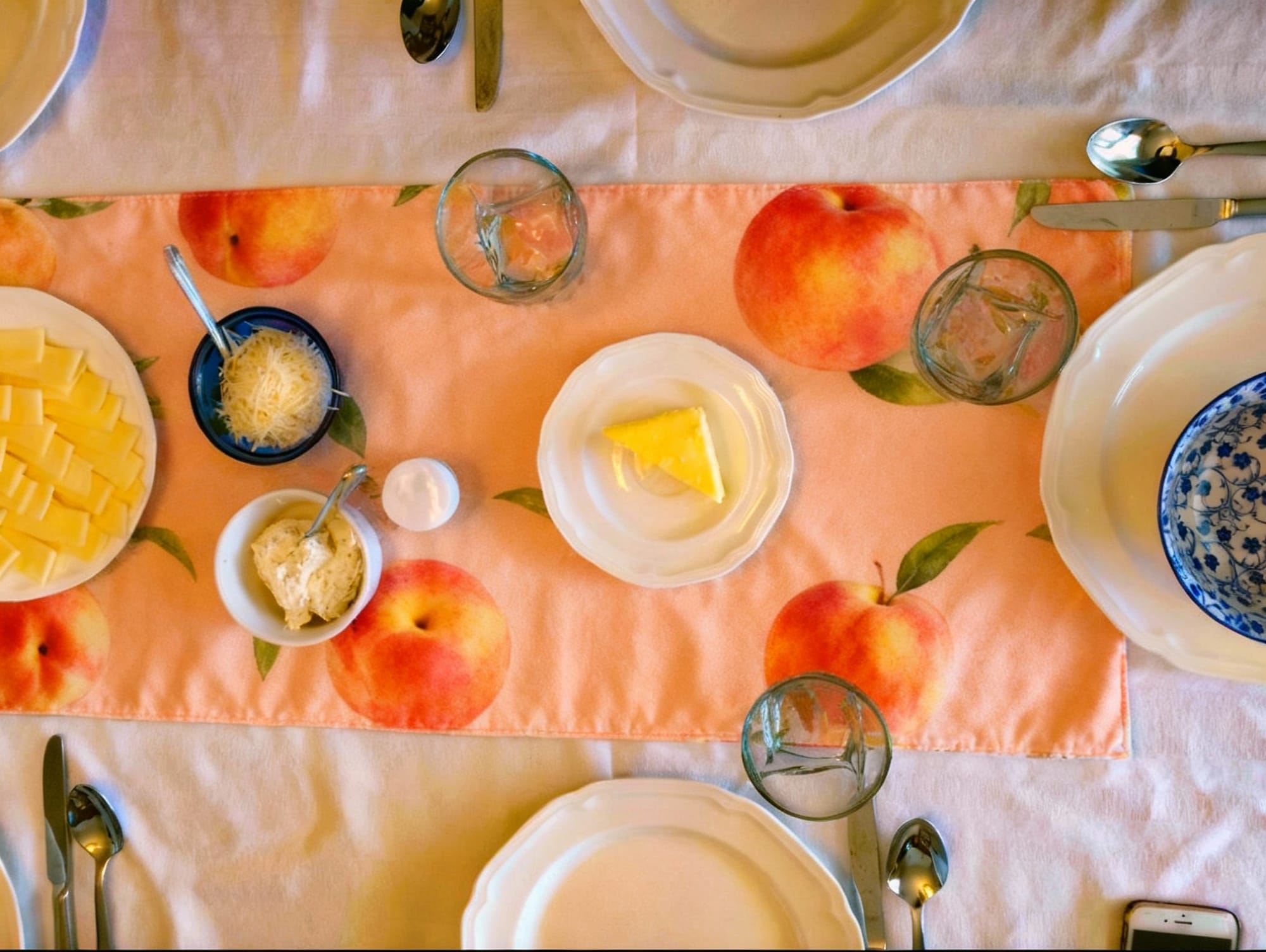 Layer a burlap or linen runner with small peach‑colored fabric peaches, twine, and a few dried peach slices to evoke Victoria’s family orchard. Add a tiny wooden sign that says “Nash Peaches” for a nostalgic, farm‑fresh feel.