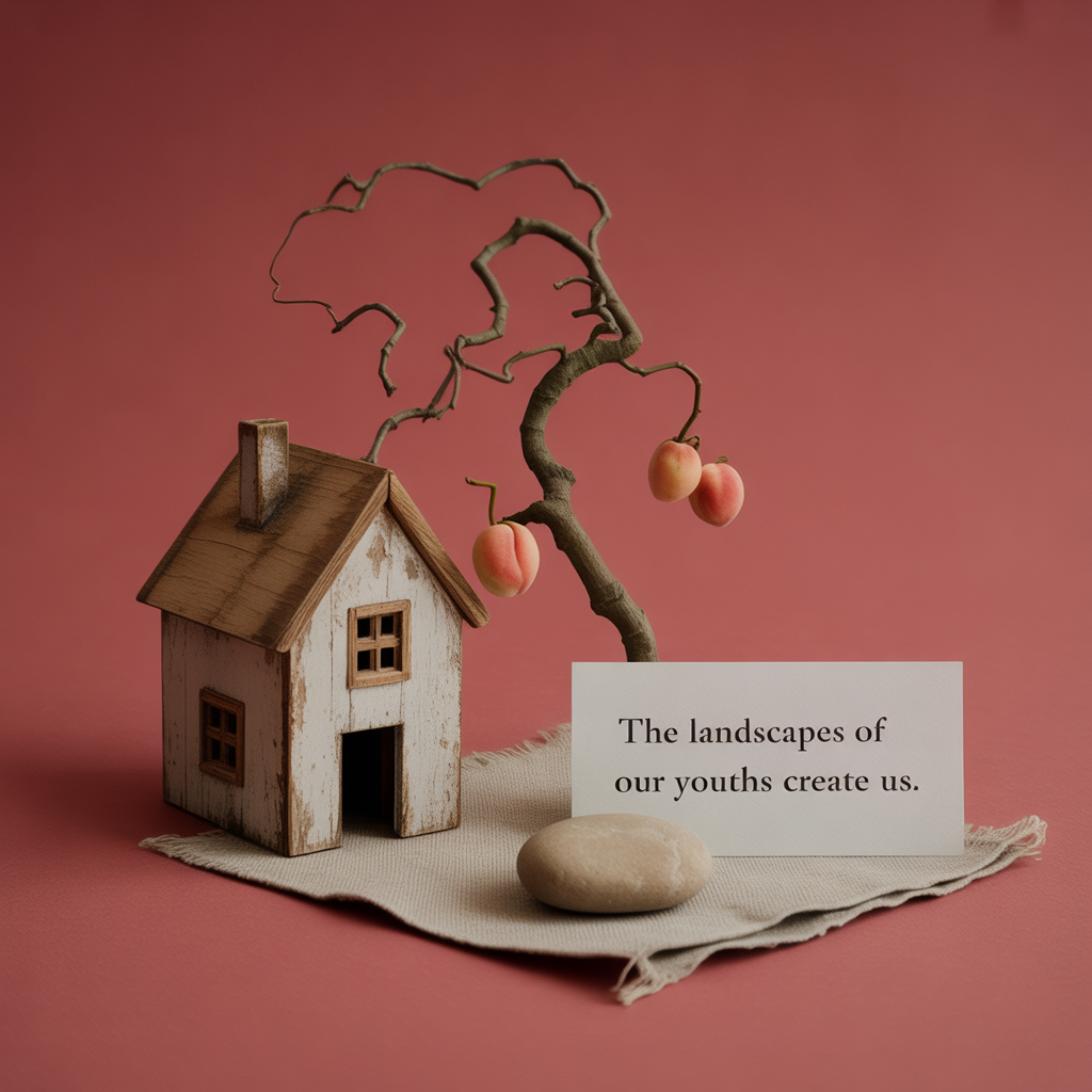 Arrange a small wooden house, a peach tree branch, and a river stone on a linen square, with a card that reads “The landscapes of our youths create us.” This quiet station invites reflection on what “home” means to each guest.