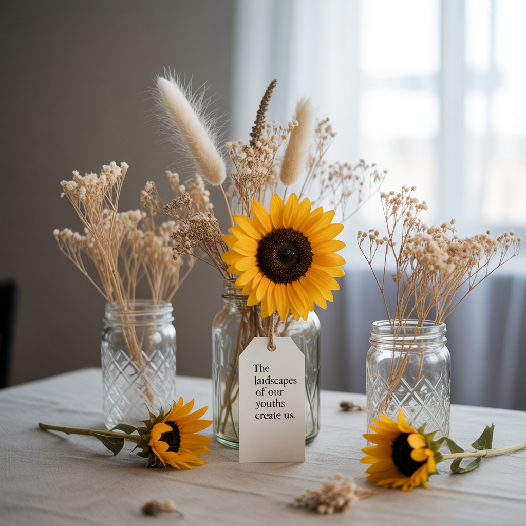 Scatter dried or faux wildflowers (sunflowers, lupines, and wild roses) in mason jars or small vases to mirror the blooms Victoria notices in the wilderness. A simple tag with “The landscapes of our youths create us” ties the flowers to the novel’s theme of memory.