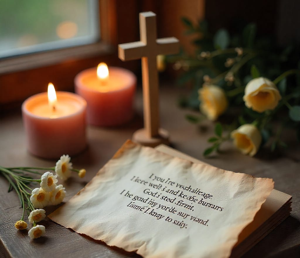 Create a quiet vignette with votive candles, a simple wooden cross or illuminated manuscript image, and parchment cards featuring brief psalm lines to mirror the characters’ prayer rhythms in the cave. Pair a second card about doubt and belief to reflect the story’s nuanced theme of faith under pressure.