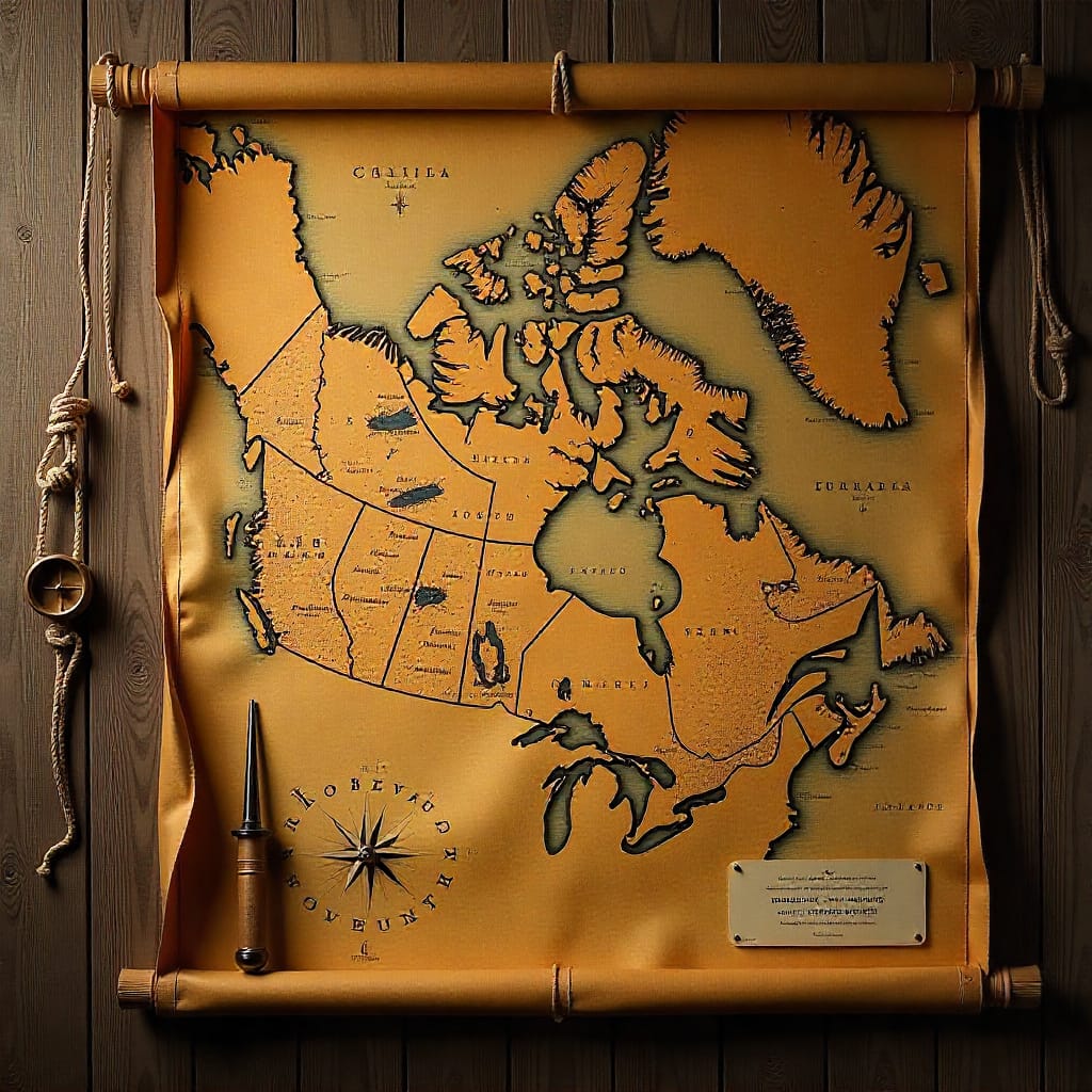 Pin up a reproduction 16th‑century map of New France, add a compass, and tie a few simple rope knots to nod to the expedition that leads to marooning in the Gulf of Saint Lawrence. A small placard noting Roberval’s colonial venture and the sea route frames the historical arc without crowding the space.