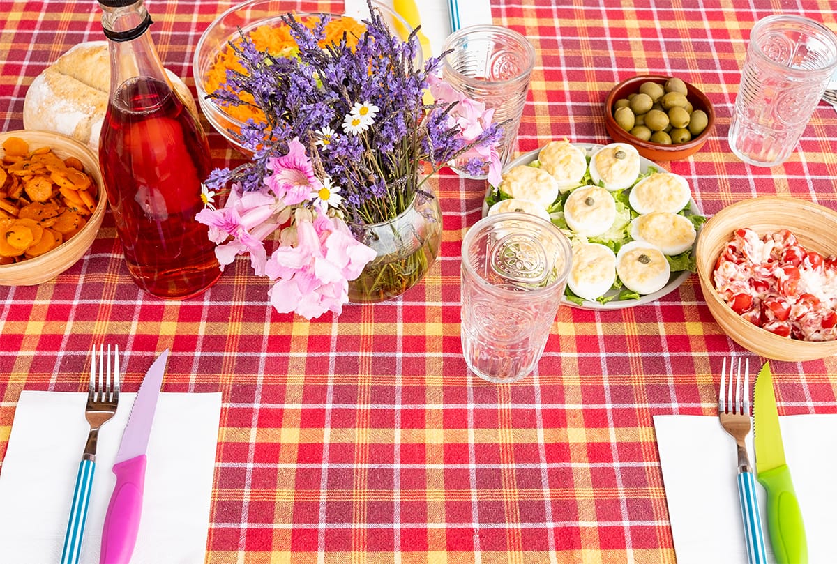 Checkered Linens: Red-and-white or blue-and-white checkered tablecloths and napkins evoke a rustic, picnic feel reminiscent of riverbank meals.