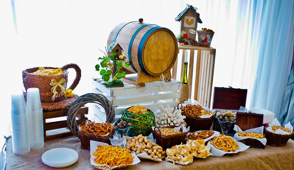 Wooden Crates & Barrels: Stack small wooden crates or barrels to create a rustic display for snacks or drinks.
