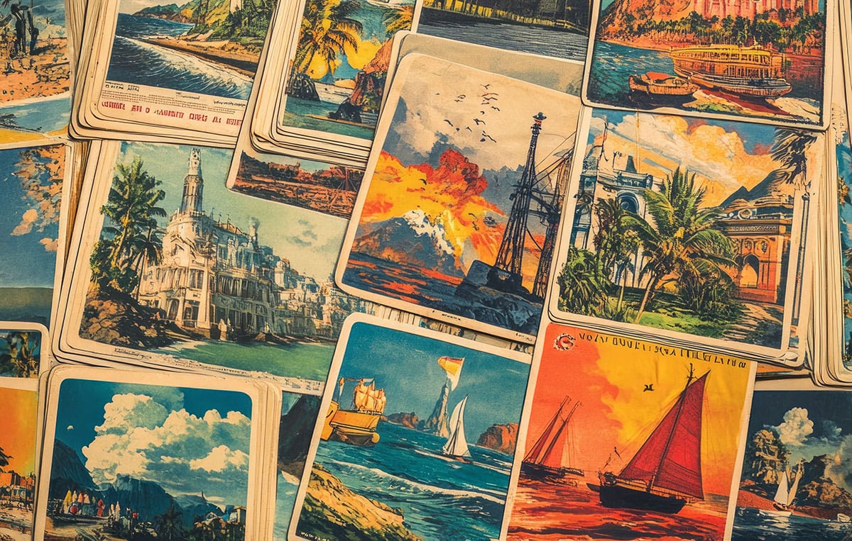 Set up an old suitcase filled with art postcards and notes to evoke Louisa’s journey and the treasured postcard she kept.