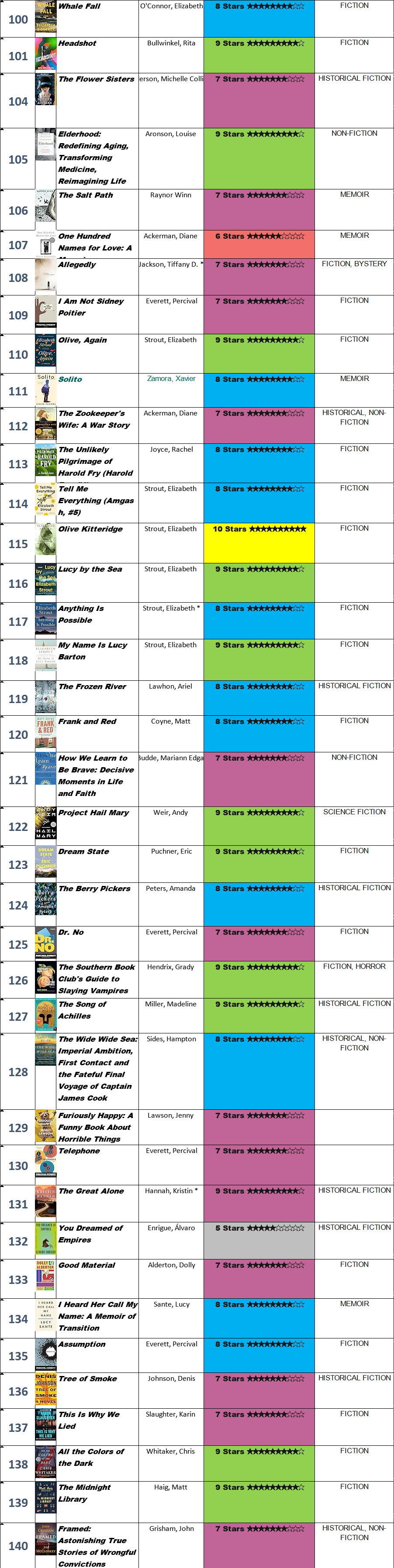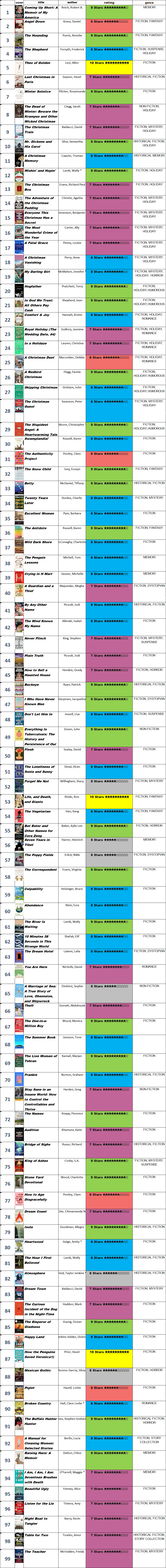 The list below is color coded per the number of stars I gave each one, from the crème de la crème (bright yellow) down to the gray "well, someone probably loved it." Only five books earned the coveted 10-star rating—yes, I'm a tough grader, and no, I don't feel bad about it.
