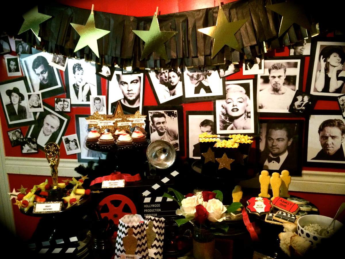 - Backdrop: Hang a DIY “Hollywood” sign or a black-and-white photo collage of classic movie stars to set the mood.