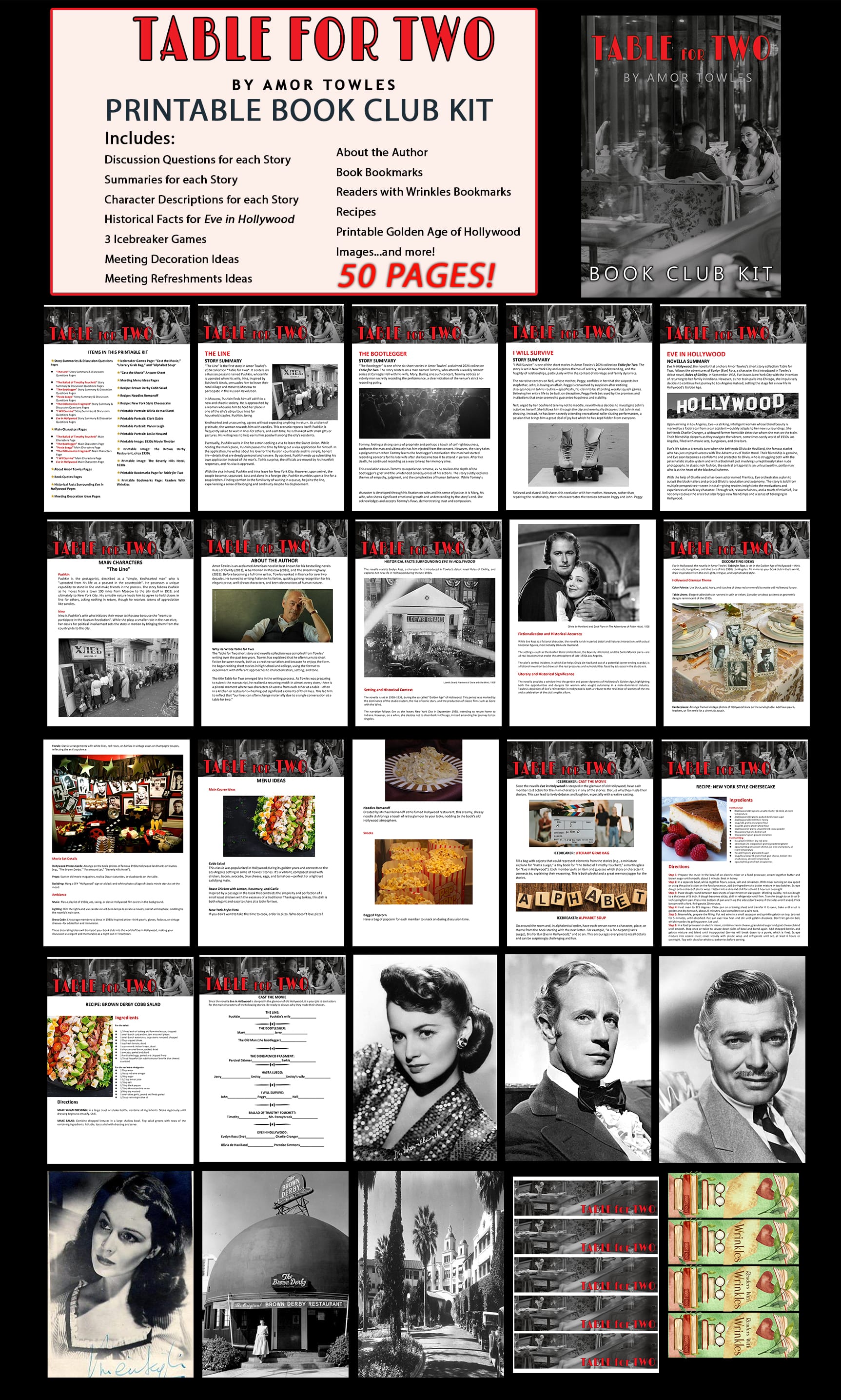 Here’s a set of general discussion questions for Table for Two by Amor Towles. The Printable Kit includes discussion questions specific to each story and the novella. Since Table for Two is a collection of short stories (with one novella, Eve in Hollywood), these questions are designed to work for the collection as a whole.