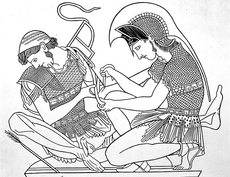 As a young prince, Patroclus inadvertently kills another boy, leading to his exile and incognito residence at the royal palace in Phthia. There he meets Achilles, and the two youths become inseparable, despite Achilles' mother, Thetis' objections. The pair live together in Achilles' room and are sent for military training under Chiron, the centaur, because, well, if you were a male in ancient Greece, that's what you did: train to be a soldier. Eventually, after Paris kidnaps Helen, they join the Greek armies in the Trojan War.